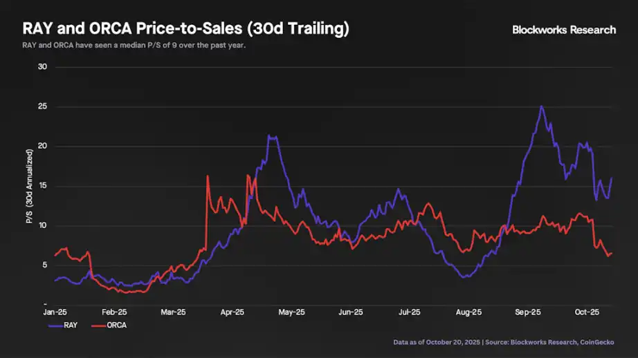 关于估值,我们可以将 Raydium 和 Orca 作为可比公司。下图显示了 RAY 和 ORCA 今年至今基于 30 日年化数据的市销率。我们观察到,直到 9 月份之前,这两种资产的定价比率相对相似,之后 RAY 开始以溢价交易。从更广的视角看,这两种资产在 2025 年的市销率中位数为 9 倍。