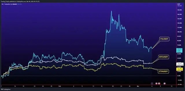下图显示了比特币 (BTC)、以太坊(ETH) 和 Filecoin (FIL)之间的价格比较。