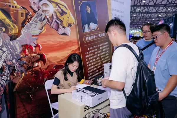 在 WF2025 的 52TOYS 展位,《猛兽匣:金属之歌》小说作者、曾荣获**科幻银河奖**新人奖的科幻作家王诺诺被粉丝层层环绕。小说以其精美的装帧与引人入胜的设定,刚亮相便让资深玩家与科幻爱好者眼前一亮,纷纷将其列入收藏清单。现场等候签售及购买的粉丝排起长龙。