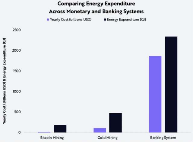 CoinShares断言,如果使用可再生能源的总量,比特币挖矿可以说超过了世界上几乎所有的其他行业。对黄金和传统金融行业的发展做一个更直观的对比(见下图)。