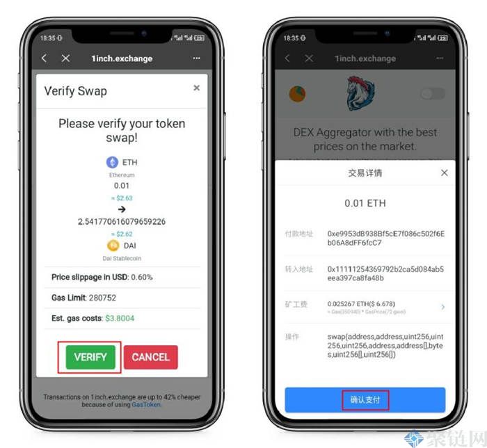 5.以上信息确认后点击“SWAP NOW”立即兑换,然后点击“VERIFY”确认付款,验证钱包密码完成交易。