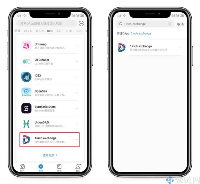 1.用手机给网友详细讲解,可以下载TokenPocket创建以太坊钱包,在钱包中找到界面DeFi专栏打开https://app.1inch.io/或在顶部搜索栏输入1inch.exchange打开。