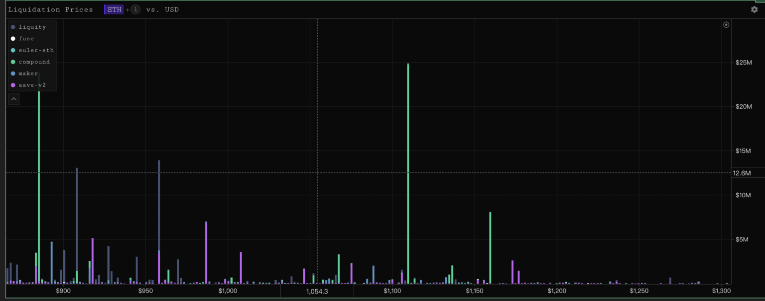 另外在DeFi清算压力方面,据parsec.finance数据,目前以太坊在1,109至1,159美元区间有近2,500万美元链上清算压力,主要来自Compound。假若以太坊再跌破1,200美元,这些资金将面临被清算的风险。