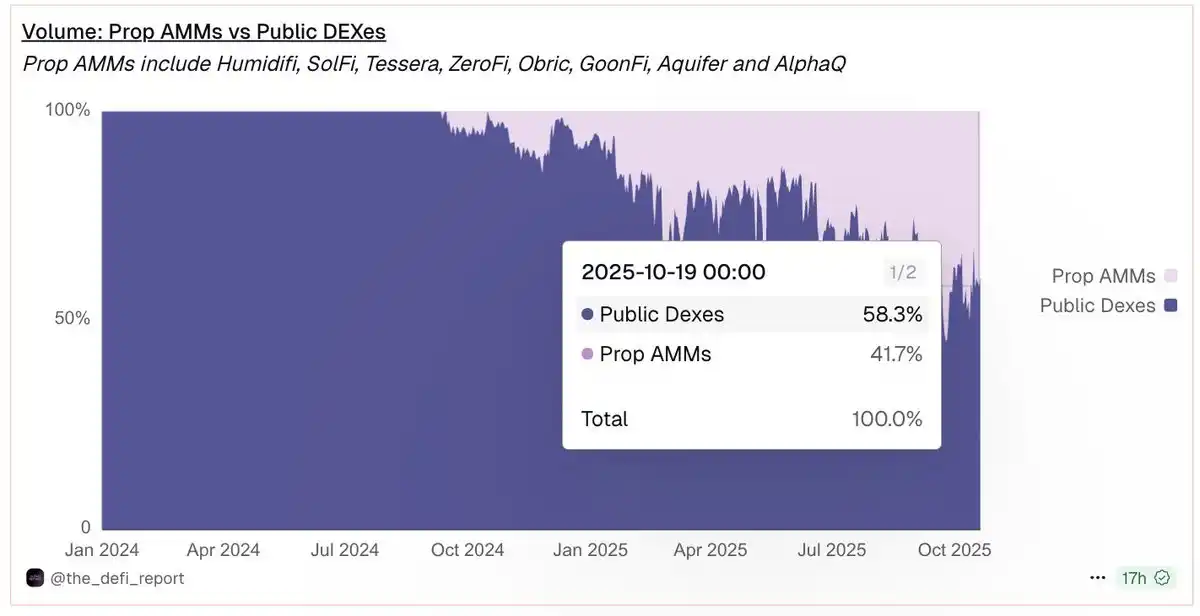 专业自动做市商(Proprietary AMMs,简称 Prop AMMs)正在迅速成为 Solana DeFi 生态中的主导力量,目前它们已经贡献了主要交易对中超过 40% 的交易量。这类由专业做市商运营的专门流动性场所,能够提供深度流动性和更具竞争力的定价,核心原因在于它们显著**了做市商被利用「过期报价」(stale quotes)进行抢跑(front-running)套利的风险。