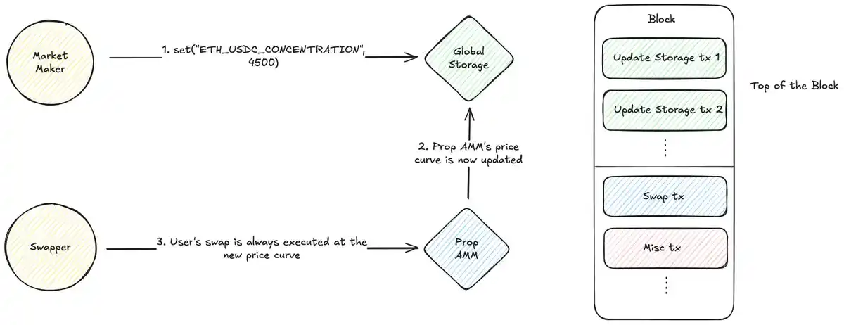 虽然标准 EVM 架构使此类操作成本高、风险大,但新的设计为解决这个问题提供了不同的方法。结合链上全局存储智能合约和链下构建器策略的新设计,可创建专用「快速通道」,保证区块顶部执行更新,同时建立本地、受控的费用市场。这不仅使 Prop AMM 在 EVM 上可行,也可能为所有依赖区块顶部预言机更新的 EVM DeFi 带来变革。