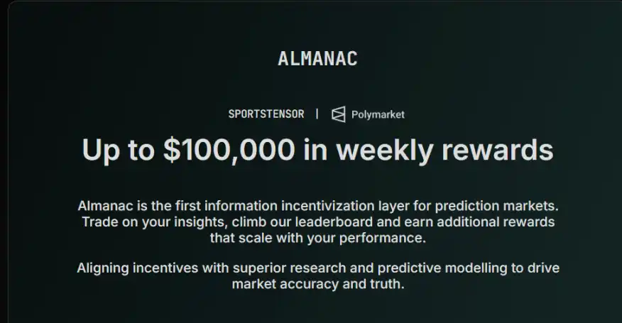 该团队还在打造「Almanac」平台——这是一个面向普通用户的体育预测竞赛层:用户可获取 Sportstensor 矿工提供的信号及**预测分析数据,并借此与其他用户展开竞争。表现**的预测者每周可获得高达 10 万美元的奖励(上线时间待定)。