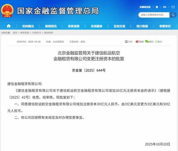 财经10月27日讯 日前,北京金融监管局公布相关批复,同意建信航运航空金融租赁有限公司(简称“建信航运航空金租”增加注册资本30亿元人民币,由3亿美元变更为3亿美元和30亿元人民币。以下是相关批复正文: