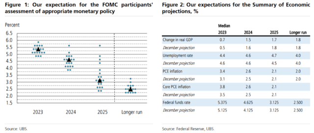 高盛和瑞银也持类似看法:2023年的利率峰值中值预期维持在5.4%,2024年的三次降息将使中值预期降至4.6%,而2025年为3.1%。长期利率的中值预期可能会保持在2.5%,但在分布上会有一个上升的趋势。2023年核心PCE通胀的预测中值可能会走高,接近4%。
