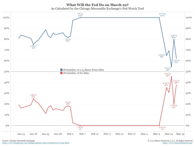 恐慌和不安的情绪已经笼罩着美国市场数周。就在两周前,由于通胀和就业数据仍旧强劲,市场还在为50个基点的加息幅度定价。但在硅谷银行和 Signature Bank接连倒闭后,人们对美国银行体系的信心突然崩溃,加息前景变得更加复杂。