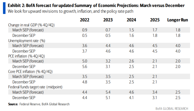 美银预计2023年的新利率峰值为5.4%,2024年为4.6%,2025年为3.4%,这将比12月的预测分别高出25bp、50bp和25bp。FOMC在声明中将保留关于“持续上调”联邦基金利率目标区间的措辞。
