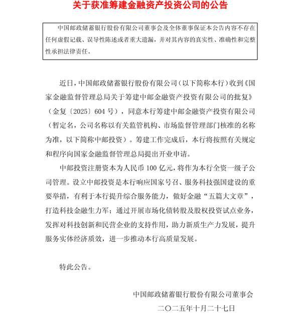 财经10月28日讯 10月27日,邮储银行发布公告称,近日,该行收到《**金融监督管理总局关于筹建中邮金融资产投资有限公司的批复》(金复〔2025〕604号,同意邮储银行筹建中邮金融资产投资有限公司(暂定名,公司名称以有关监管机构、市场监督管理部门核准的名称为准,以下简称中邮投资。筹建工作完成后,邮储银行将按照有关规定和程序向**金融监督管理总局提出开业申请。中邮投资注册资本为人民币100亿元,将作为邮储银行全资**子公司管理。