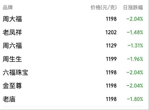 **黄金饰品克价也多数跌破1200元。10月28日,周大福足金(饰品、工艺品类价格为1198元/克,周生生足金饰品价格为1199元/克,老庙足金饰品价格为1198元/克,老凤祥足金零售价为1202元/克,周六福足金饰品价格为1129元/克。