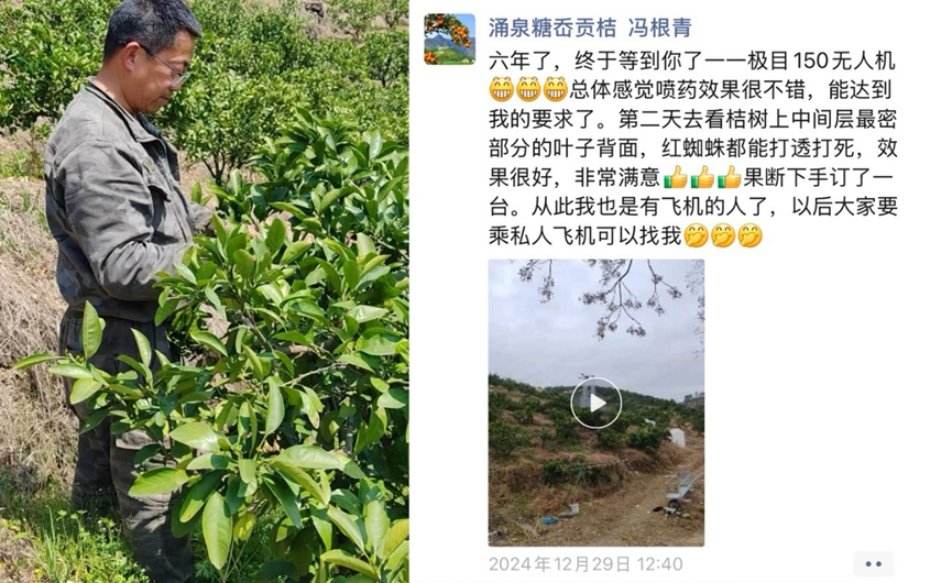 去年底,浙江台州农户冯根青使用极目科技J150植保无人机**完成自家蜜桔园的清园工作,他连发三条朋友圈,对极目无人机的肯定简直溢出屏幕。
