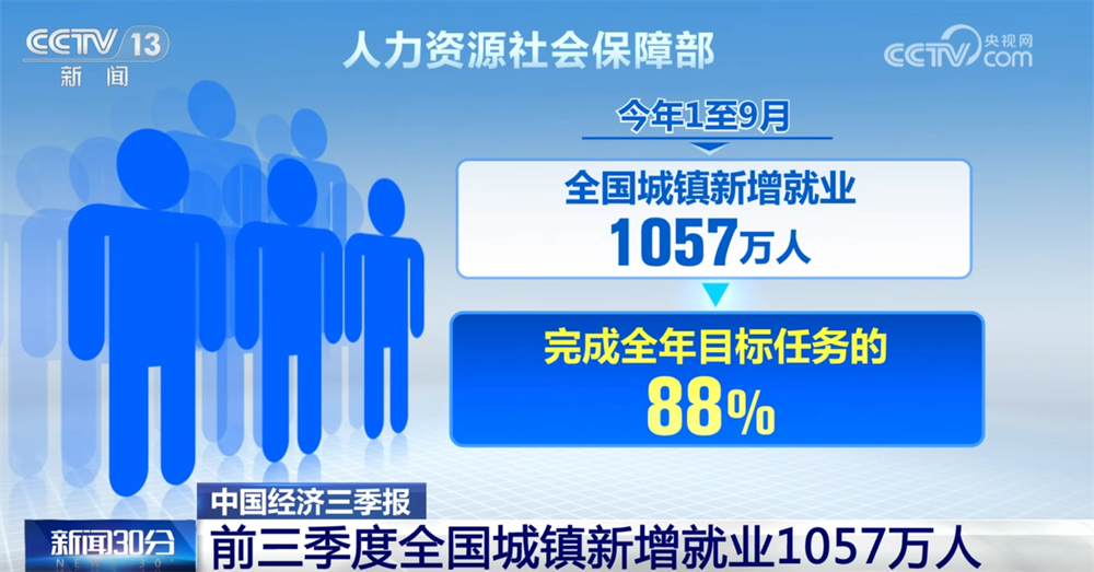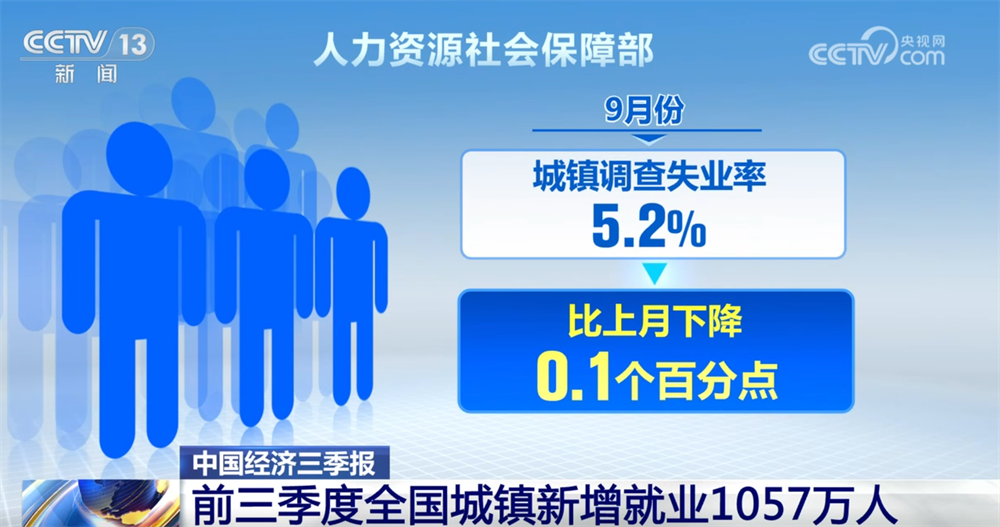 1至9月,**城镇新增就业1057万人,完成全年目标任务的88%。9月份城镇调查失业率5.2%,比上月下降0.1个百分点。