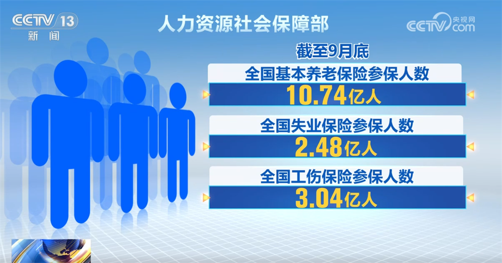 截至9月底,**基本养老、失业、工伤保险参保人数分别为10.74亿人、2.48亿人、3.04亿人,职业伤害保障试点累计参保人数超过2200万人。**社保卡持卡人数达13.9亿人,覆盖98.9%的人口,其中11亿人领用电子社保卡。
