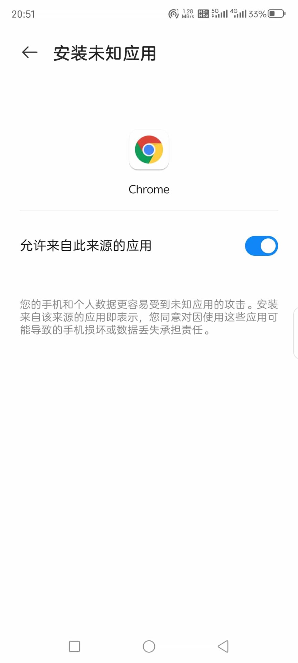 安装后关闭"未知来源" (推荐): 为了设备安全,安装完成后建议回到设置中,将刚才开启的浏览器安装权限关闭。