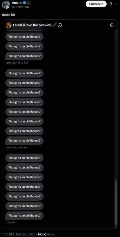 「短信轰炸」**把 Ansem 给炸了出来,「Thoughts on chillhouse?」成为了 Solana 生态的梗,现在看到评论区中英文区玩家们时不时莫名其妙地跳出一句「Thoughts?」,其实就是该梗的简化。该梗并不是真的要问 KOL 们对 Chillhouse 的看法,更多是一种「牛皮糖式」的吸引关注的耍宝,就像我的朋友问我,今天天气如何?而我直接蹦出三句,你怎么看 Chillhouse?不分对象,也不分场景。