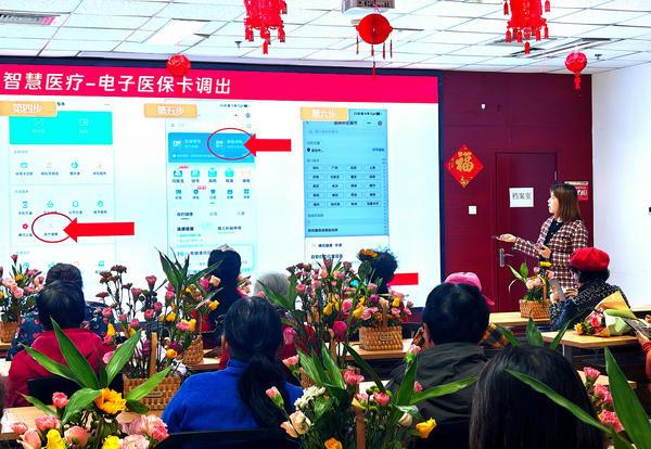 “大家先打开微信,点右下角‘我的’,找到‘服务’按钮,”爷爷奶奶们看到医疗健康了吗?”咱们常用的电子医保卡就在这里啦!”课堂上,张凡老师手持手机实物演示,身后的大屏幕同步放出“大图标 红箭头”的清晰课件,把电子医保卡激活流程拆成简单步骤,反复演示。针对社区老人常用的安卓机型,她特意跳过复杂操作,只聚焦“允许定位—点击医疗健康—刷医保码—同意激活”等关键环节,确保每位老人都能跟上节奏。