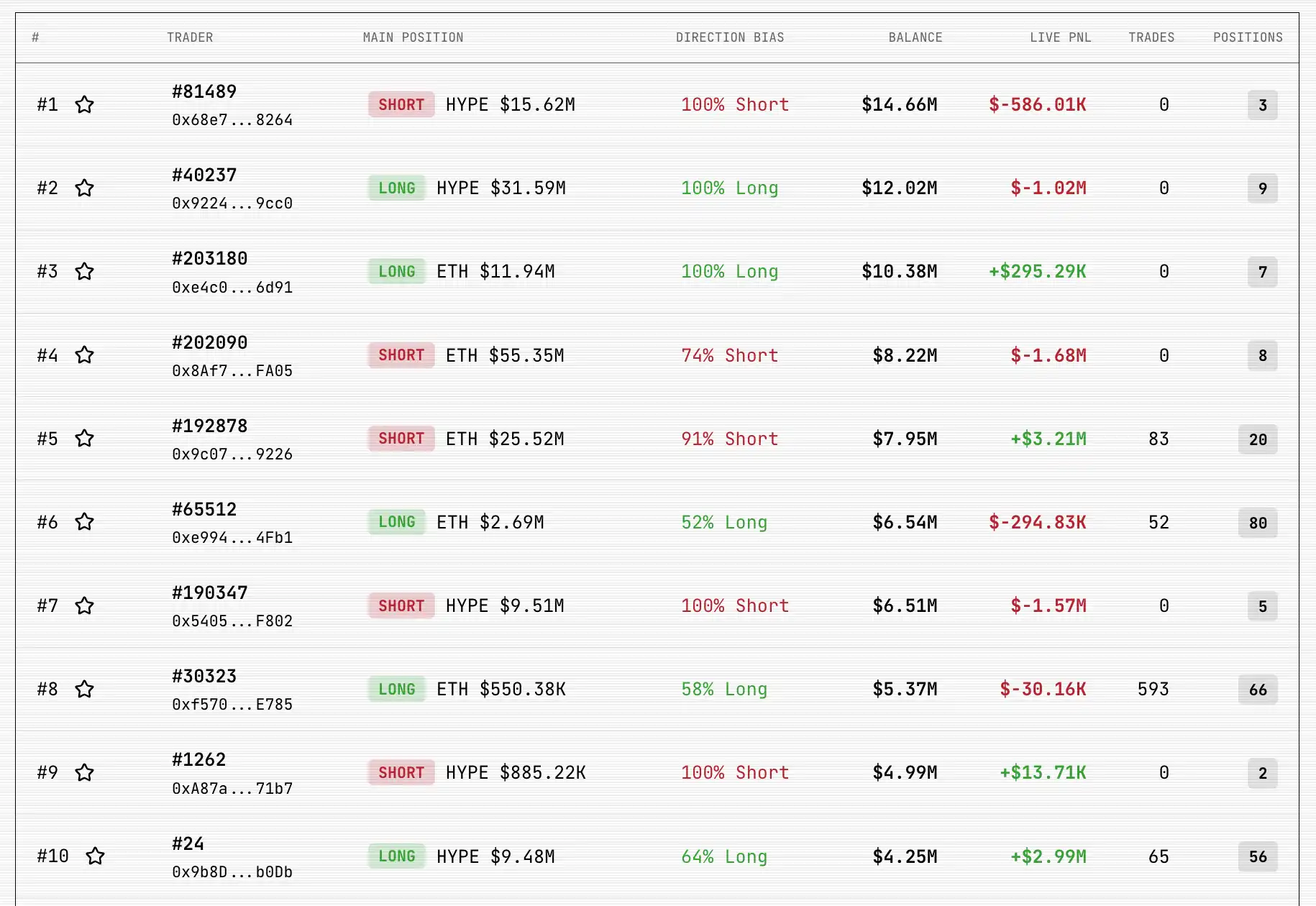 lighter 的前十名交易者主要集中交易 ETH 和 HYPE 两个品种。排行榜**名的交易者以 ETH 空头为主要仓位,总仓位价值 2,552 万美元,已实现盈利 321 万美元,共执行 83 笔交易,持有 20 个仓位。