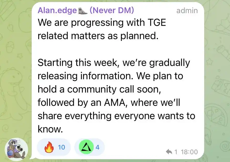 edgeX 管理员在 Telegram 群组中进一步确认,**E 相关事宜正按计划推进。从本周开始,团队将逐步公布相关信息,不久将举行社区电话会议和问答环节,让用户充分了解**经济模型和分配方案。