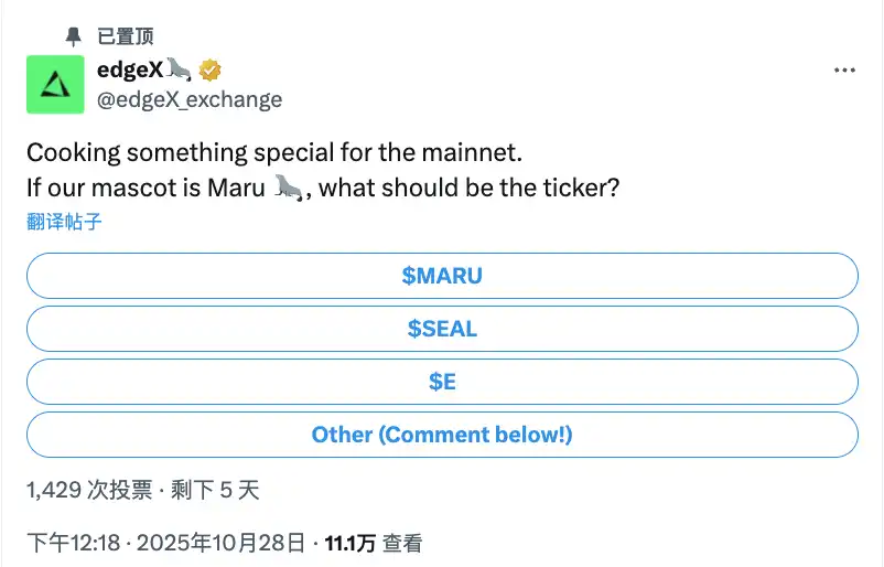 edgeX 官方推特发起了一项引发广泛关注的投票:"为主网准备特别的东西。如果我们的吉祥物是 Maru(海豹),**符号应该是什么?"这条推文在 24 小时内获得超过 11.1 万次浏览和 141 条回复,被多家媒体解读为 **E 即将到来的明确信号。