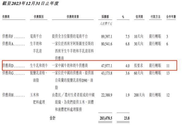 宜品集团与供应商D的合作时间长达11年,2023年其供应类别为“生牛乳和奶牛”,2022年为“生牛乳”。宜品集团2023年向“供应商D”的采购金额为4797.71万元,占当年总采购额的4%;2022年采购额为3570.25万元,占比3.2%。