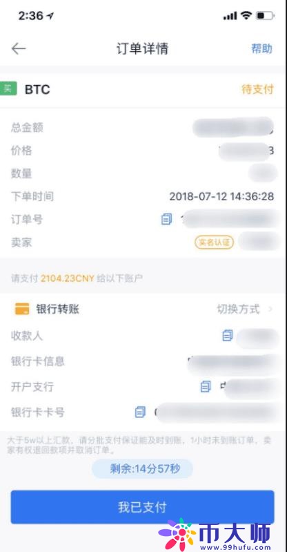 5.进入支付详情页面,可根据页面提示的卖家账号信息,进行支付,确认支付成功后,点击“我已支付”即可,等待对方放币。