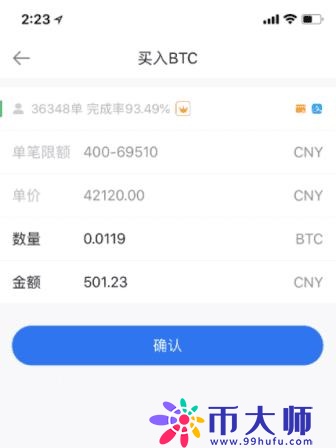 3.点击“买入”,进入“买入BTC”页面,可查看该商家的订单、完成率、支付方式及挂单信息,可输入想买入的数量及金额,点击“确认”;