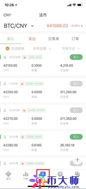 2.选择BTC/CNY,可在“买入”“卖出”页面查看所有挂单,可根据需求选择“优质商家”及在“所有方式”中选择支付方式,选择合适价位及商家,点击“买入”;