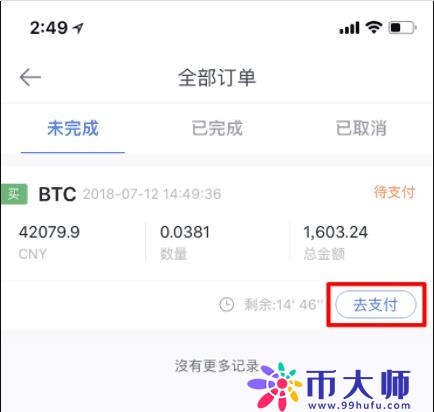 4.确认后,点击“订单”,选择未完成订单,可看到买入的订单信息,点击“去支付”;