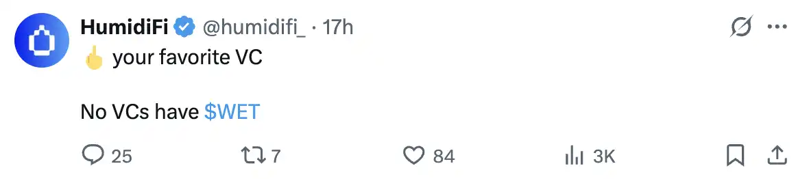 值得注意的是,HumidiFi 团队在 Twitter 上明确表示「没有 VC 份额」,这在当前充斥着低流通高 FDV 的市场环境中显得格外难得。