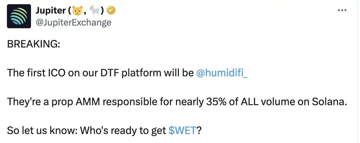 在 10 月 30 日晚间的 community call 中,Jupiter 团队宣布了他们的 ICO 平台 DTF 的首期发射项目:HumidiFi,**标识为 WET