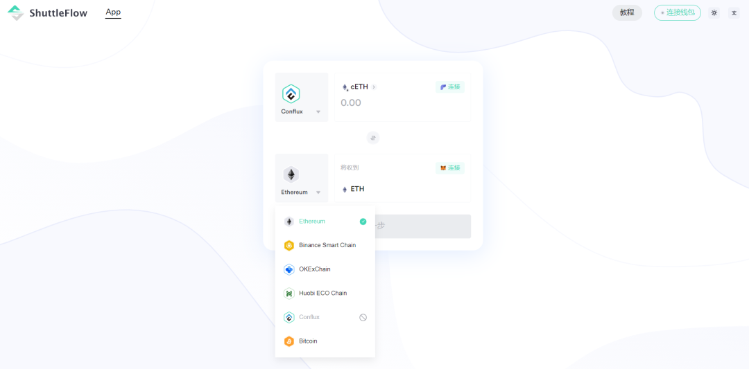 ShuttleFlow 通过 Conflux 链作为中继桥梁支持资产跨链,支持 Fluent 或 MetaMask。当前 ShuttleFlow 支持 ETH、LINK、USDC 等 49 种资产在 Conflux、BSC、Ethereum、Bitcoin、HECO、OKExChain 六个网络上跨链。