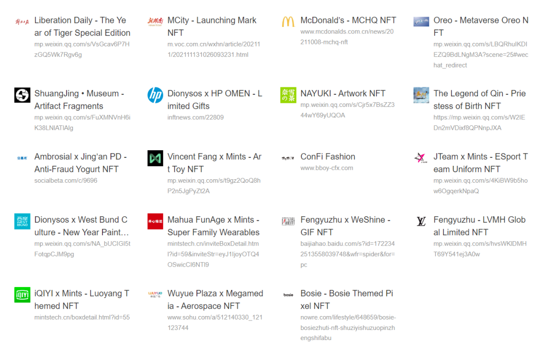 合规数字藏品Conflux 目前已与多个 Web2 品牌进行数字藏品/NFT 方面的合作(如下图)。Conflux 联合创始人张元杰曾在去年 10 月时表示,现已经有超过 800 万个数字藏品在 Conflux 发行,超过 300 万的独立用户,服务了超过 300 个品牌 IP,其中不乏爱奇艺、解放日报、开心麻花等知名**品牌。