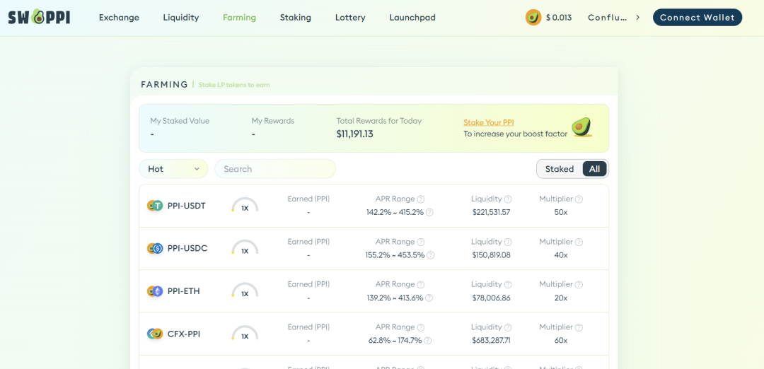 Swappi 是 Conflux 链上最常用的 DEX,用户可以使用交易、流动性挖矿、质押、以及 Launchpad 等功能,支持包括 BNB、ETH、WBTC 、USDC、CFX 在内的 15 种资产交易,以及 CFX-ETH、CFX-USDT、CFX-WBTC 、CFX-USDC 等 19 种流动性挖矿 LP。Swappi 已推出治理 T抹茶en PPI 以及 Genesis Pass NFT ,该 NFT 可以给持有者带来白名单、其他 Conflux eSpace 项目的空投**等权益。据 DeFiLlama 数据,当前 Swappi TVL 约 1200 万美元,占 Conflux 全链 TVL 的 82%。