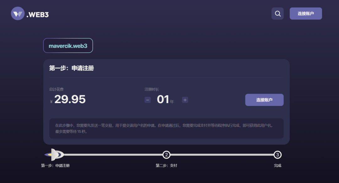 ".web3 用户名"是基于 Conflux 链的用户名系统。首批支持 .web3 用户名的有:Anyweb,ConfluxScan,Fluent,heyfoo,数盒,晒啦,Meta Name,区块积木,淘派等。目前开放注册 5 位及 5 位以上的用户名,费用为 30 元一年,可通过支付宝扫码支付;后续会逐步开放注册 5 位以下的用户名,目前仅面向**大陆市场开放。