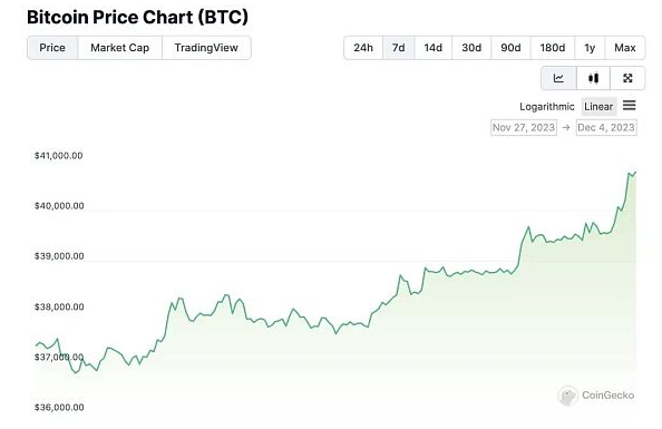 2023年12月5日消息,比特币时隔 578 天重回 40,000 美元上方。12 月 4 日 6 时 30 分左右,BTC 价格突破 40,000 美元,截至撰稿前,BTC 价格为 40,744 美元,24 小时涨幅 3.5%。比特币作为区块链的龙头概念,也跟上了 AI、新能源等科技股板块齐上涨的强劲走势,据 CoinGecko 数据,2023 年,比特币价格上涨 139.9%,市值达 7973 亿美元。