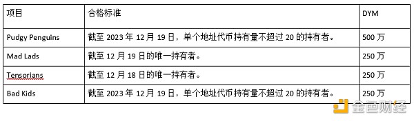 Solana建立了一个专门的社区和**的用户体验,成功塑造了Dymension的产品愿景和未来发展轨迹。因此,我们从各种协议中编译了一个超过180,000个地址的列表用于分发1000万DYM(占总供应量的1%),这些协议有Wormhole、Tensor、Drip.Haus等。为了获取分发**,这些地址必须在12月19日之前至少持有1 SOL。
