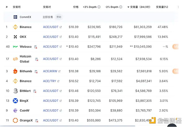 ACE的主要交易场所为币安(47.48%),其次是okX(13.94%)和Bithumb(5.93%)。