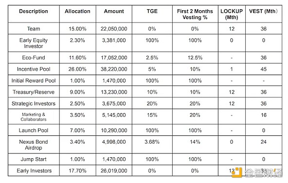 **中**的分配如下比例,团队和投资者将分配约总体40%的**量;通过计算**E可得当前流通量为21,969,520枚,10,290,00枚由币安启动池发放,早期股权投资者持有3,381,000枚**,占当前流通量的15.38%。