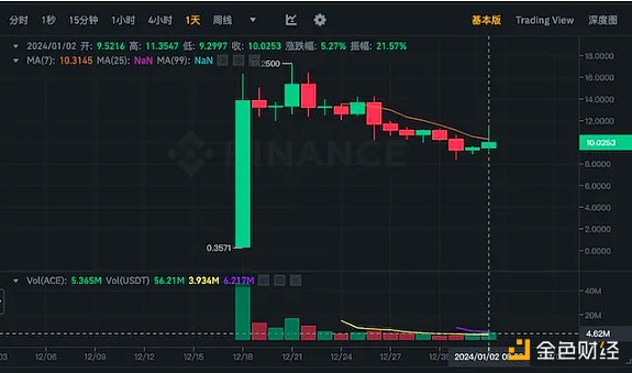 近24小时币安现货交易量近期有所增长,为536w枚**,自12.22日价格下跌13%至13美元后日交易量逐步减少,7日交易量约为200w-500w枚ACE/日。