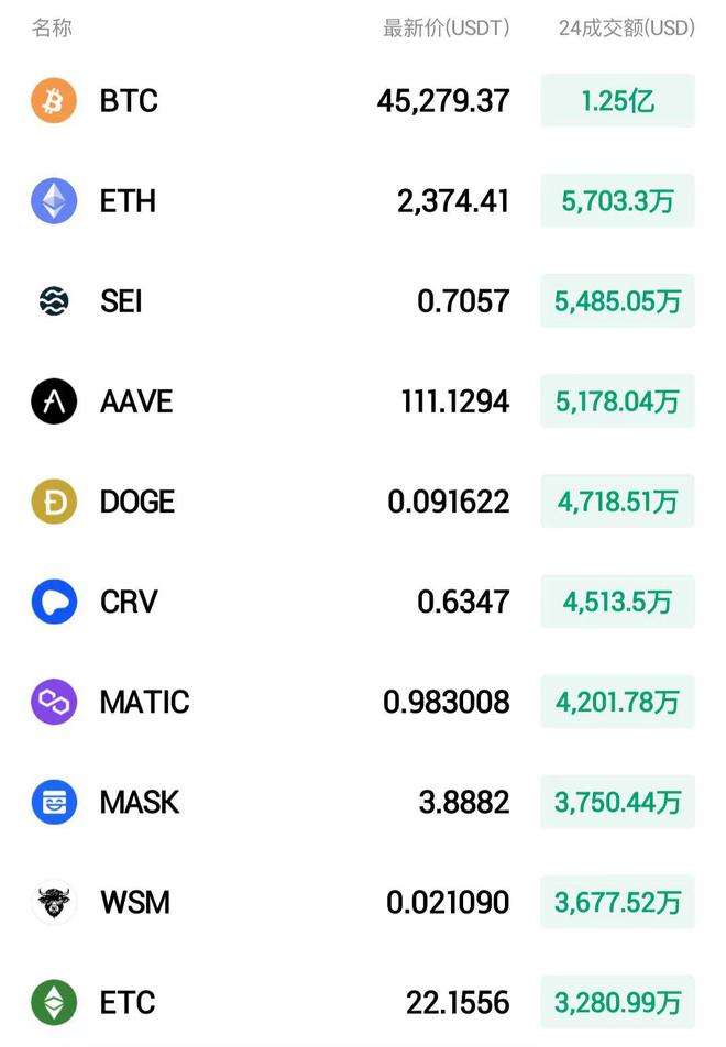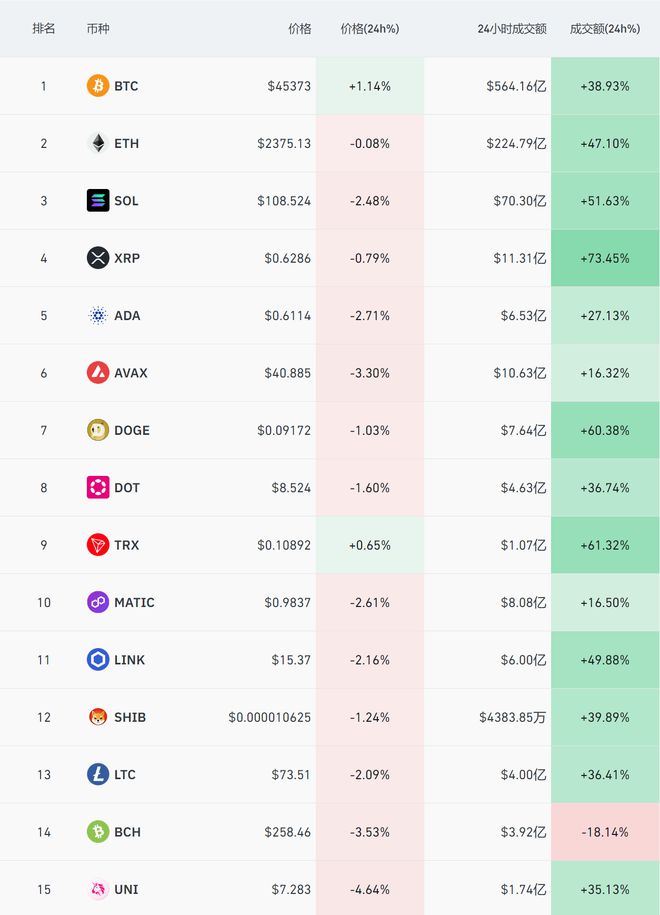 比特币(BTC)过去24h继续上涨,涨幅为1.14%,**报45873美元,**报44154美元,波动率3.79%。以太坊(ETH)走势较弱,下跌0.08%,**报2430美元,**报2345美元,波动率3.56%。