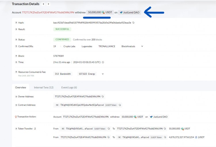 大量50,000,000 usdt(约50,044,124美元)被转移。转移发生从