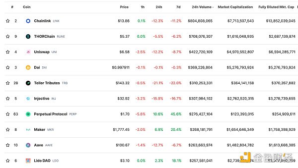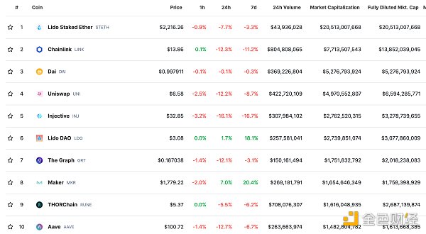 DeFi总市值及前十** 数据来源:coingecko