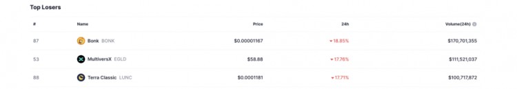 Bonk、MultiversX、Terra Classic 是加密货币跌幅最大的公司