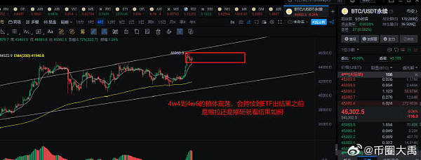 2024.1.32023年,大A经历了许多波动与变化。由于宏观经济环境的复杂和多变,大A仍然呈现出整体震荡的走势。美联储将进入降息周期,全球流动性由紧转松,北向资金流出的抽水效应将减弱甚至逆转;可能出台更多利好政策。**就是盈亏比,大A向上的弹性要大于向下的弹性。上证综指3000点处于长期支撑线上,下跌空间相对有限。当前股债性价比处于历史高位,表明现在进场的性价比更高。技术面日线:目标48000不变,今早这笔合约拉到45487,预计在这个位置还要盘整一段,再向上冲刺四小时线:这笔要开始44000-46000的箱体震荡了,等待ETF结果公布,可以高抛低吸15分钟线:昨日**插到44600,给到了回调上车的机会,但是是半夜,也没多少人上车吧操作计划:均价为41800的多单继续持有