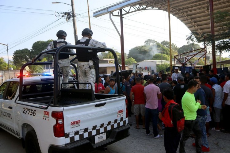 周六,在墨西哥恰帕斯州马帕斯特佩克市,墨西哥国民警卫队成员正在看守那些抛弃前往美国的大篷车的移民。