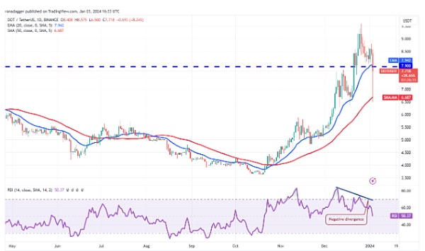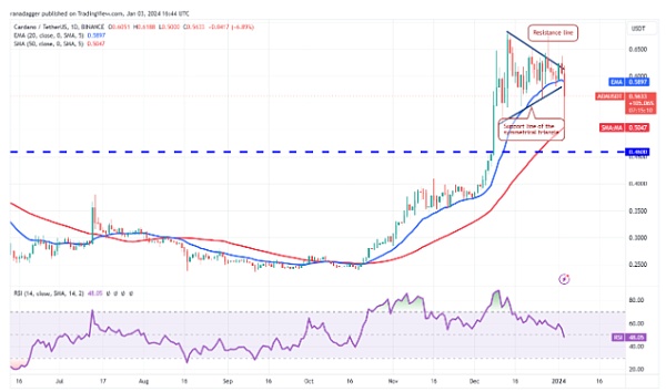 1 月 3 日抛售加剧,空头将价格拉至三角形支撑线以下。ADA/USDT 货币对跌至 50 日移动平均线(0.50 美元),但烛台上的长尾显示较低水平的强劲买盘。