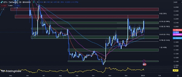RSI 已从昨天的 64.06 跌至 48.87,脱离超买区域。此外,MACD柱状图已从正值0.0007翻转为负值-0.0005,表明看涨交叉失败。这些指标的综合表明 CFX 价格可能进一步下跌。在价格图表上,CFX 面临 0.2073 美元至 0.2127 美元之间的直接阻力,该阻力位与 0.2095 美元的 Fib 0.236 水平一致。该区域在过去一周提供了支撑,但可能会转变为阻力。低于当前水平,初步支撑预计在 0.1851 美元至 0.1967 美元之间,与斐波那契 0.382 水平(0.1967 美元)一致。