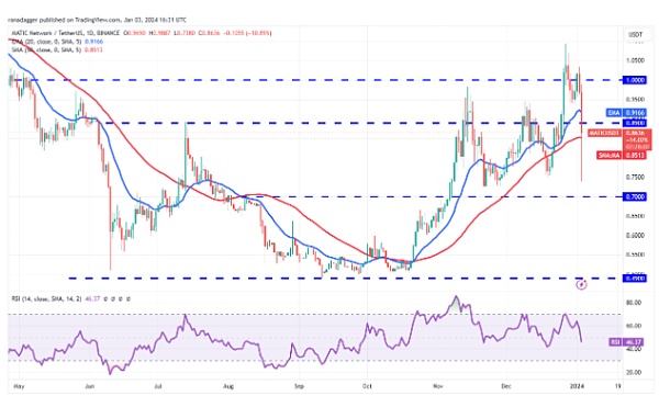 1 月 2 日,价格下跌并跌破 1 美元。1 月 3 日,MATIC/USDT 货币对大幅下跌,跌至 0.74 美元。这种急剧下跌表明该货币对在一段时间内仍将在 0.75 美元至 1 美元之间波动。